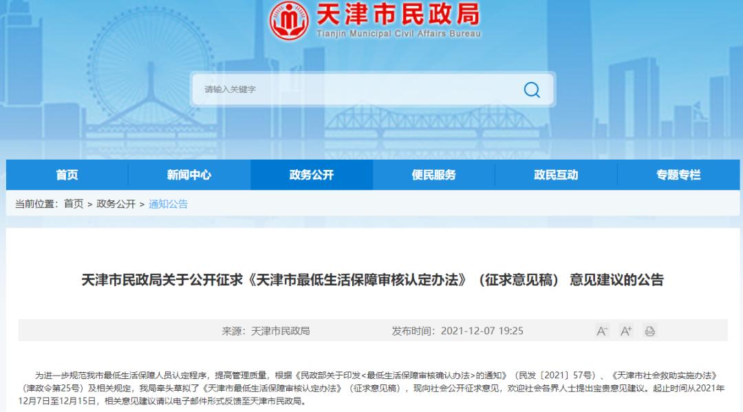 为进一步规范我市最低生活保障人员认定程序,麦克人才提高管理质量,近日,天津市民政局牵头草拟了《天津市最低生活保障审核认定办法》(征求意见稿),其中明确—— 区级人民政府民政部门负责本行政区域内低保工作;乡镇人民政府(街道办事处)承接区级民政部门按程序委托下放的最低生活保障审核确认权限; 乡镇(街道)应当自受理最低生活保障申请之日起3个工作日内,启动家庭经济状况调查工作。