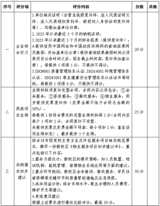 为科学、规范地完成中共三亚市委党校会务、教务、餐饮及物业劳务外包服务项目采购工作(以下简称“物业服务项目”),麦克人事代理确保采购需求公平、公正、公开且符合市场实际,根据《中华人民共和国政府采购法》及《政府采购需求管理办法》(财库〔2021〕22号)等相关规定,现发布本次采购需求调查征询公告。 一、项目概况 (一)项目名称:中共三亚市委党校会务、教务、餐饮及物业劳务外包服务项目 (二)项目内容:新校区与老校区的综合物业服务,涵盖设施维护、秩序安全、环境服务、会务接待、餐饮服务及学员住宿保障等。 新校区建设项目位于吉阳区学院路龙泉山谷。总用地面积129282.91平方米(约193.92亩),总建筑面积99132.01平方米(其中,地上建筑面积73621.15平方米,地下建筑面积25510.86平方米)。用地控制性指标为建筑限高24米、绿地率≥45%、建筑密度≤20%、容积率≤0.6,主要建设教学中心、会议报告中心、对外党际交流中心、图书信息与教务管理中心、学员食堂、文体中心、A号和B号学员宿舍楼、后勤用房等9栋单体。截至目前,新校区主体建筑安装工程完成约95%。预计2025年11月竣工交付,2025年12月31日全面启用。 (三)预算情况:项目估算金额1880万元。 (四)调查目的:通过市场调研,优化采购需求的技术参数、服务要求及成本构成,避免排他性或倾向性条款,确保符合市场实际和公平竞争原则。 二、资格要求及提交材料 (一)报名条件 1.符合《中华人民共和国政府采购法》第二十二条规定的条件:具有独立承担民事责任的能力;具有良好的商业信誉和健全的财务会计制度;有依法缴纳税收和社会保障资金的良好记录;参加政府采购活动前三年内,在经营活动中没有重大违法记录。 2.本项目不接受联合体参与需求调查。 (二)提交材料(按照本公告评分表逐项准备材料,均需加盖公章) 1.单位综合实力相关证明材料。 2.2023年1月以来类似项目业绩证明材料。 3.《物业服务项目初步建议书》(内容应具有针对性,字数约2000字)。 4.本地化服务能力及证明材料。 5.承诺函。书面承诺收到《采购需求确定书(征求意见稿)》后,2个自然日内提交书面反馈意见。 6.联系人信息表(含单位名称、联系人、职务、联系电话及电子邮箱)。 (三)提交时间 1.文件提交时间(送达时间):自公告发布之日起5个自然日,于2025年10月10日18:00前送达至市委党校。 2.接收方式:现场接收。提交材料必须确保封装完好无损,并在文件提交结束时间之前送达指定地点。 3.文件份数:一式五份。 三、遴选流程与评分标准 本次调查采用“公开报名、量化评分、择优遴选”的原则,确保过程透明、公平。 (一)遴选流程: 1.报名截止后,我校将成立评审小组,根据下方评分表对所有符合要求的报名单位进行综合评分,并按照得分由高至低进行排序,确定前5名单位作为正式需求调查的对象。若符合要求单位不足5家,则至少保证3家单位入围。如无法满足至少3家单位的要求,将重新启动遴选程序并发布公告。 2.遴选结果将在中共三亚市委党校官网公示。 (二)评分表(总分100分)