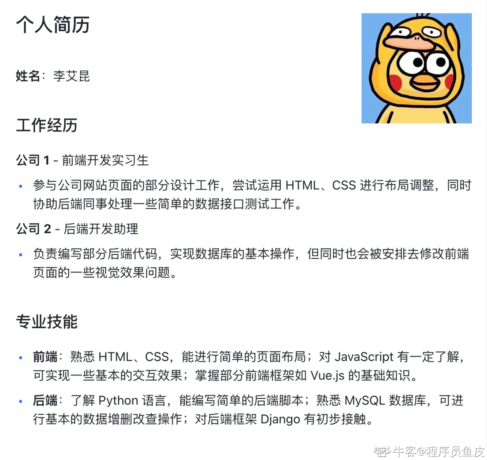 当然可以!而且解决方法很简单。 3)缺乏亮点,如何补充?首先是仿写,看到别人简历上好的内容,记录下来自己去学习,学会之后也能写到自己的简历上。平时建议多读岗位相关的文章,学到的知识点也可以即时补充到简历上。 而且现在 AI 技术越来越强大,你可以利用 AI 工具生成和优化简历。比如使用 AI 分析简历中的关键词,确保它与职位要求高度匹配,提升通过筛选的概率。AI 还可以帮助你检测简历的语言风格,确保语句简洁、表达流畅,避免不必要的重复内容。还可以借助 AI 优化项目描述,增加更多的功能和优化点。