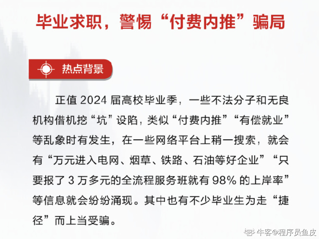 警惕这 3 种岗位! 薪资待遇离谱:开出远超行业平均水平的高薪,却对岗位要求极低。比如招聘普通文员岗位,承诺月薪过万且无需工作经验、专业技能,这种明显违背市场规律的薪资设置,极有可能是陷阱。 职责与要求不匹配:岗位描述中工作职责含糊不清,却列举了大量苛刻的任职要求。像招聘程序员,要求具备计算机主板维修经验,很可能就是招你进去做些杂活。 岗位名称怪异:使用一些冷门的、不符合行业惯例的岗位名称,比如 “财富增长专员”、“梦想孵化师”、“Bug 维修员” 等,实际工作内容可能与名称毫无关系,就是吸引你去投简历罢了。 招聘流程正规公司招聘至少会经过 1 次线下面试,而且会问和专业技能、个人经历有关的问题,全面考察求职者能力。如果一家公司仅通过几分钟的电话沟通,甚至没有面试环节,就通知求职者入职,这显然是有问题的。换位思考一下,正常的招聘方也会担心招人不慎给自己带来麻烦,不会这么草率。 还有收取费用的,什么报名费、体检费、培训费、押金,看到就赶紧拒绝吧。 此外,还要警惕招聘过于频繁的公司。有些公司长期大量发布相同岗位招聘信息、招聘人数众多、从未停止招聘,这可能意味着公司内部管理混乱、人员流动性极大,或者根本就是虚假招聘。