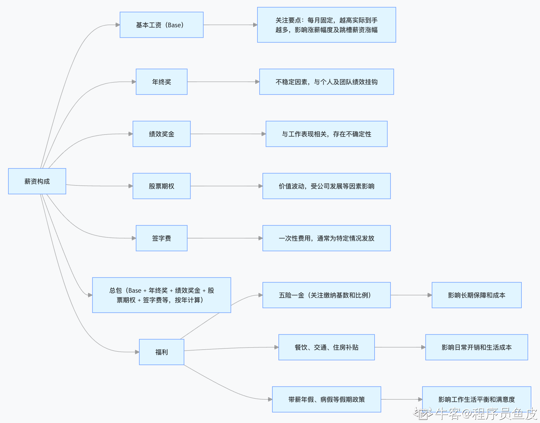 思考一下,如果让你来选择 Offer,会更关注哪些角度呢? 大多数的求职者,会更关注 薪资福利、职业发展、工作环境、公司稳定性 这 4 个角度。 1)薪资福利大家在接 Offer 和签合同时,一定要明确 Offer 的薪资构成。薪资构成一般包括基本工资(Base) + 年终奖 + 绩效奖金 + 股票期权 + 签字费等,这些加在一起按照年来计算俗称 总包 。我会更建议大家关注 Base,也就是每月固定的基本薪资,Base 越高实际到手的钱就越多。虽然现在很多大公司为了吸引人才,会通过提高每年发放的基本工资月数,再送点儿股票、期权、签字费什么的,来让总包看起来很唬人。但其实除了 Base 之外,其他的都是不稳定因素,尤其是年终奖可能会和个人及团队绩效挂钩。而且很多公司的涨薪幅度是基于 Base 薪资计算的,Base 越高,未来跳槽时的薪资涨幅可能就越大。 福利方面,主要是五险一金,要关注缴纳基数和比例。还有餐饮、交通、住房补贴,以及带薪年假、病假等假期政策等。这些都会对我们的工作和生活满意度造成影响,也要综合考虑。