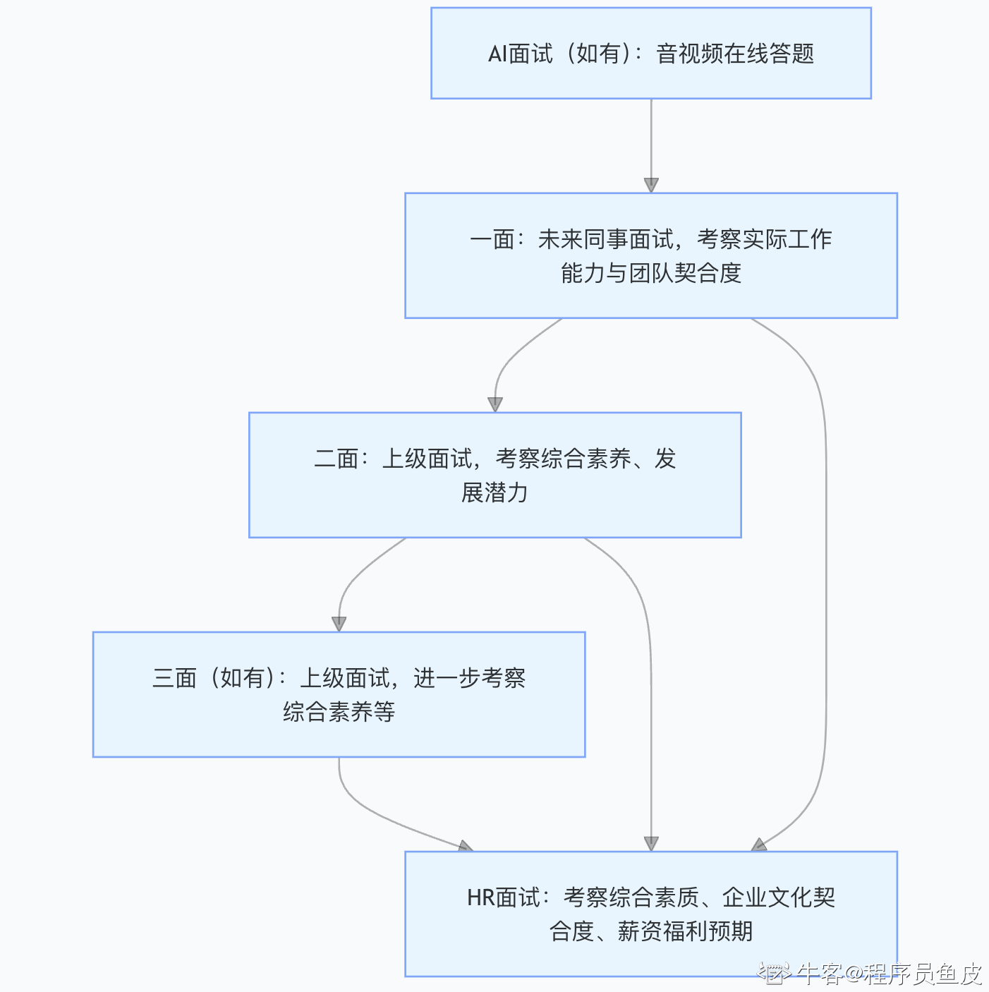 一般情况下,招聘方会在一到两周内反馈笔试结果。如果等待时间过长,可以通过邮件或电话主动联系 HR,礼貌询问笔试的进展和后续安排。 这里要给大家打一针强心剂,不要以笔试成绩的好坏评判自己的能力,也不要因为没有得到笔试结果而灰心。毕竟笔试难度又大、参加的人又多,如果不经过很长时间的准备或者不是天赋型选手的话,本来通过率就低;而且招聘方搞笔试测评也不需要太大的成本,有些可能只是一种形式,只要你的简历还不错,不做笔试也能拿到面试机会。 四、备战面试恭喜你啊,终于来到了紧张刺激的面试环节,这个阶段我要帮助大家更好地在面试时展示自己、成倍地提高面试通过率。 主要分享 4 个问题: 面试流程是怎样的? 如何高效准备面试? 有哪些面试技巧? 如何获取面试结果? 1、面试流程是怎样的?整体面试流程面试一般会有多轮,包括 N 轮专业技能面试和 1 轮 HR 面试。一面的面试官大概率是你未来的同事,他们往往更侧重于考察你的实际工作能力以及与团队的契合程度。换位思考一下,谁都不希望招一位难以沟通、聊不来的同事。 二面到三面的面试官大概率是你的上级,他们会更关注你的综合素养、发展潜力,看看你能否在团队中不断成长、承担更多职责。换位思考一下,管理者会更喜欢有自主性、有能力推动工作的兵,而不是遇到事情还要自己兜着。 如果是 HR 轮面试,面试你的大概率是 HR(纯纯的废话),会更关注你的综合素质、企业文化契合度、对薪资福利的预期等等。 此外,如今 AI 面试也越来越流行,不少公司可能会在人工面试前先加一轮 AI 面试,通过音视频在线答题的方式进行,进一步节约人力成本。