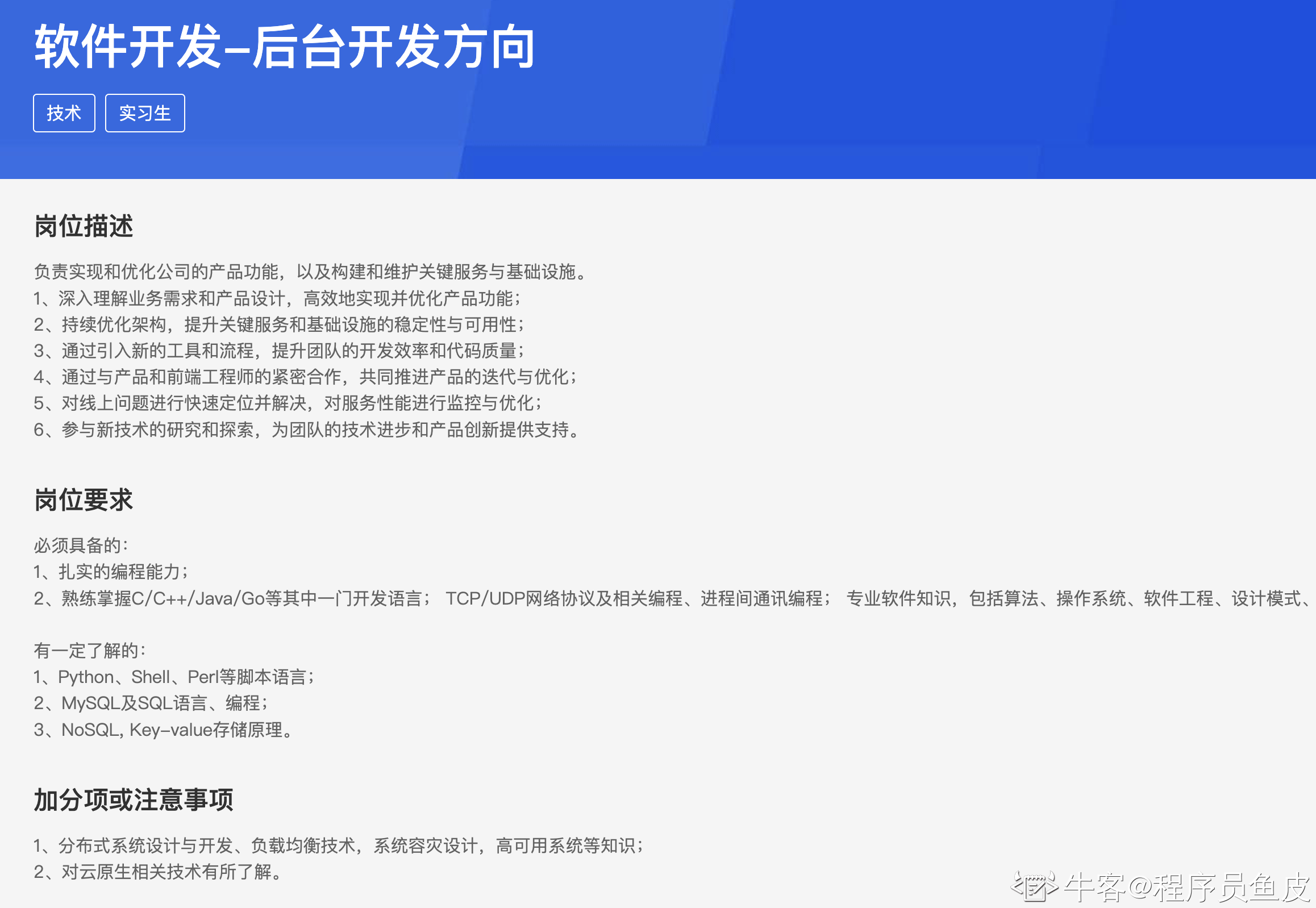 学会过滤掉那些 “垃圾岗位”,精准选择适合自己的岗位进行投递,能帮你节省很多时间精力。 那具体该怎么做呢? 看岗位描述这是招聘方主观发布的招聘要求,俗称 JD(Job Description)。一般来说,要求越详细清晰,公司越正规,比如某大厂的招聘要求: