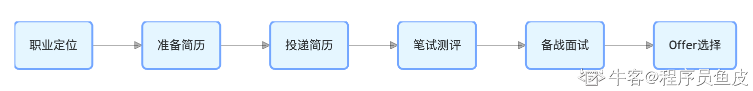一般求职过程包括以下几个阶段: 职业定位 准备简历 投递简历 笔试测评 备战面试 Offer 选择