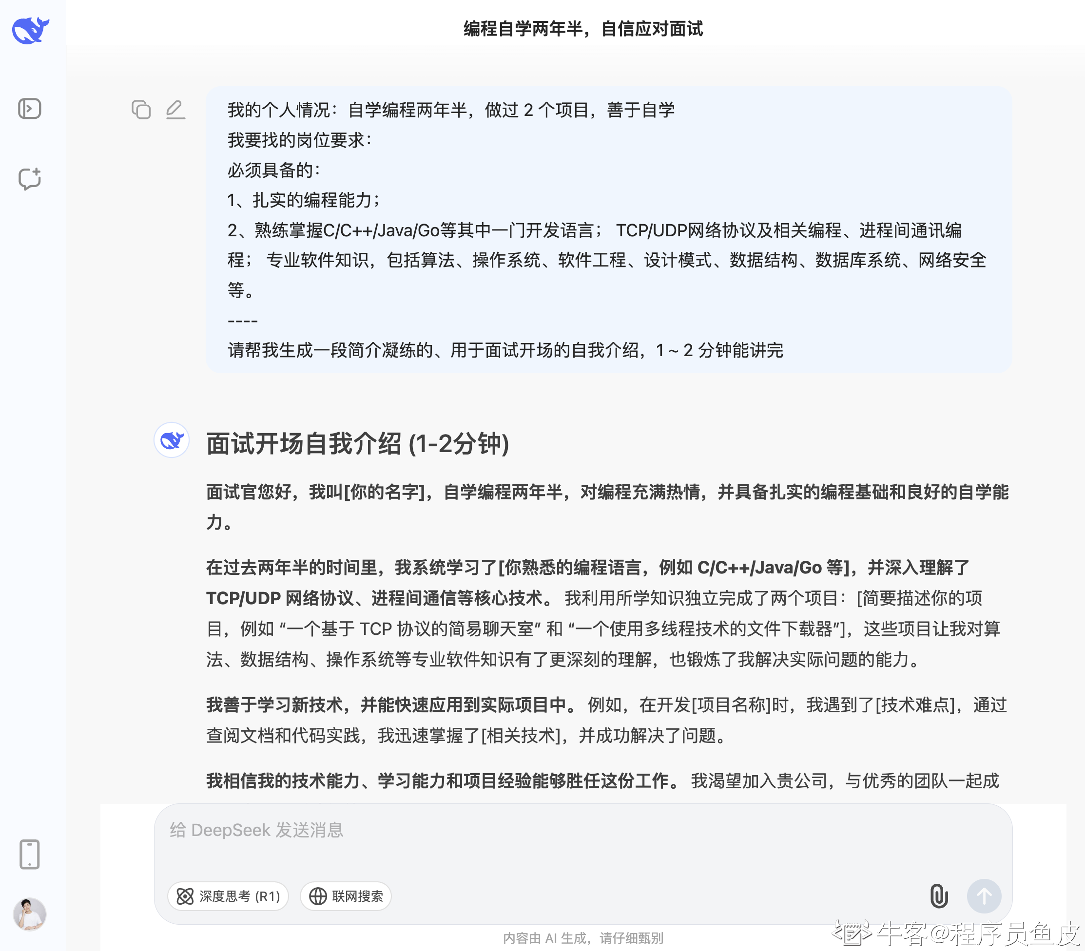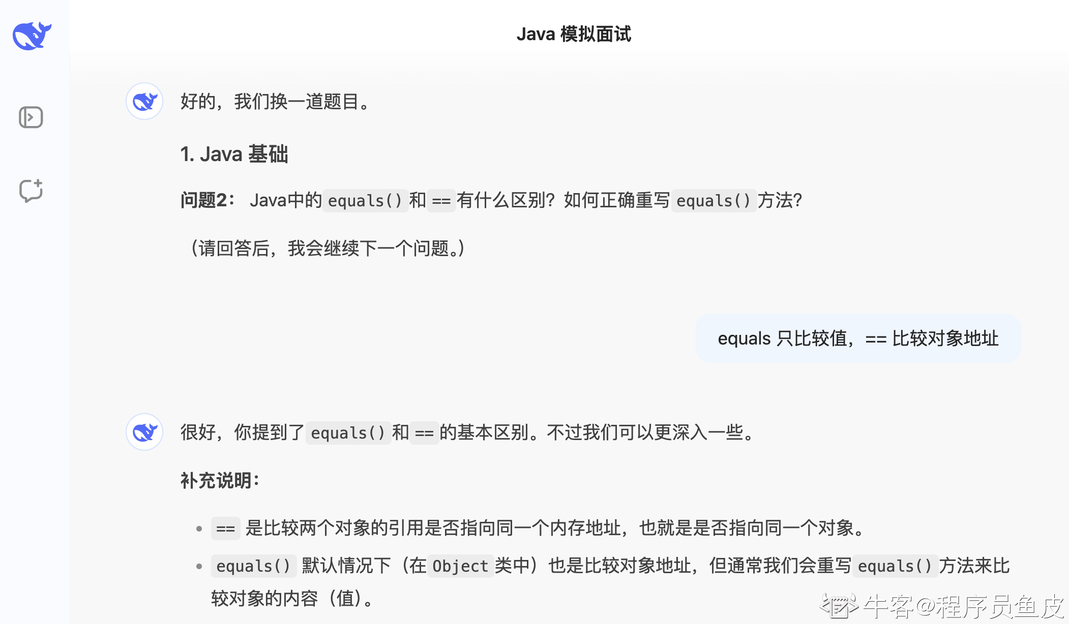 当然啦,现在我们还可以利用 AI 来帮忙模拟面试,比如告诉 DeepSeek 你是一位面试官,然后就可以让它对我们进行真实的 “拷打”。