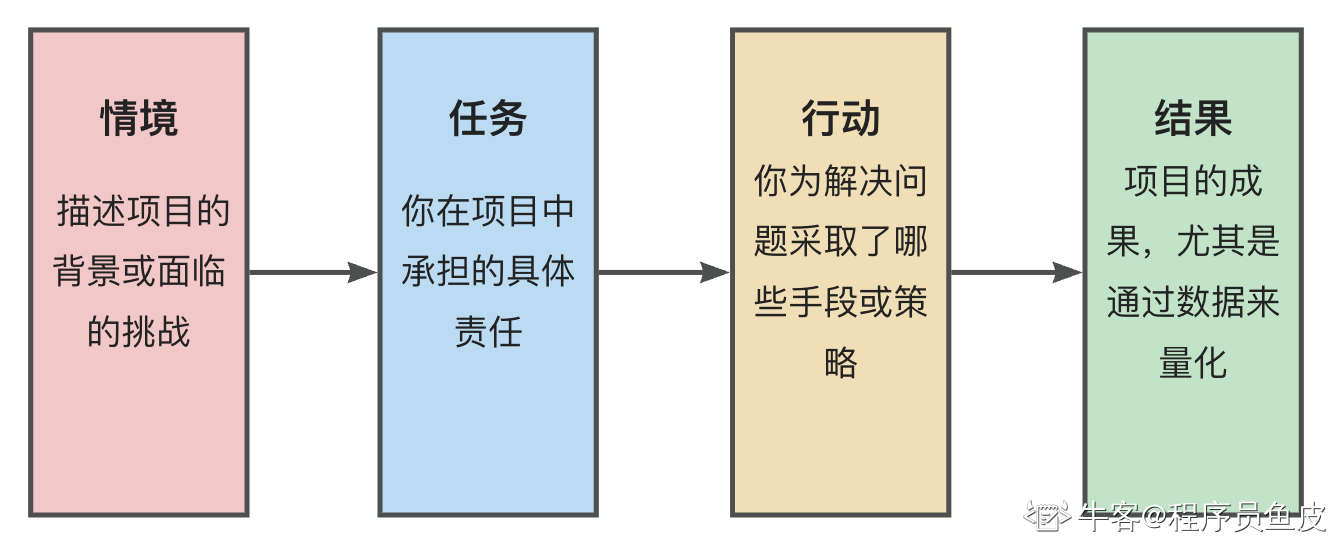 所以,优化简历的第一个技巧是:惜字如金,亮点前置。 别什么都往上写去凑字数,而是要重点写你认为最好的专业技能和作品经历,并且一定要放在简历的第一页。 【凑字数的简历 ❌】在互联网公司实习 3 个月,协助团队完成日常任务。每日查看邮件接收任务,积极与同事交流,不懂就问。曾花半天研究格式不一的大量用户数据,用 Excel 的筛选、排序、函数等功能进行清洗整理,后协助数据分析,制作柱状图、折线图等图表,还参与团队会议,学习项目管理与团队协作知识,熟悉公司工作流程 。 【惜字如金的简历 ✅】:于知名互联网公司实习 3 个月,协助处理用户数据。运用 Excel 高效清洗 50 万条格式不一的用户数据并制作数据透视表,支持市场部精准分析用户行为,助力营销活动转化率提升 20% 。 下面再分享几个核心技巧,让你的简历更专业、更真实、更有亮点和区分度。 更专业使用 STAR(Situation、Task、Action、Result)法则,在描述工作经历和项目时,结构化地展示你在项目中的贡献和成就。 情境:描述项目的背景或面临的挑战 任务:你在项目中承担的具体责任 行动:你为解决问题采取了哪些手段或策略 结果:项目的成果,尤其是通过数据来量化