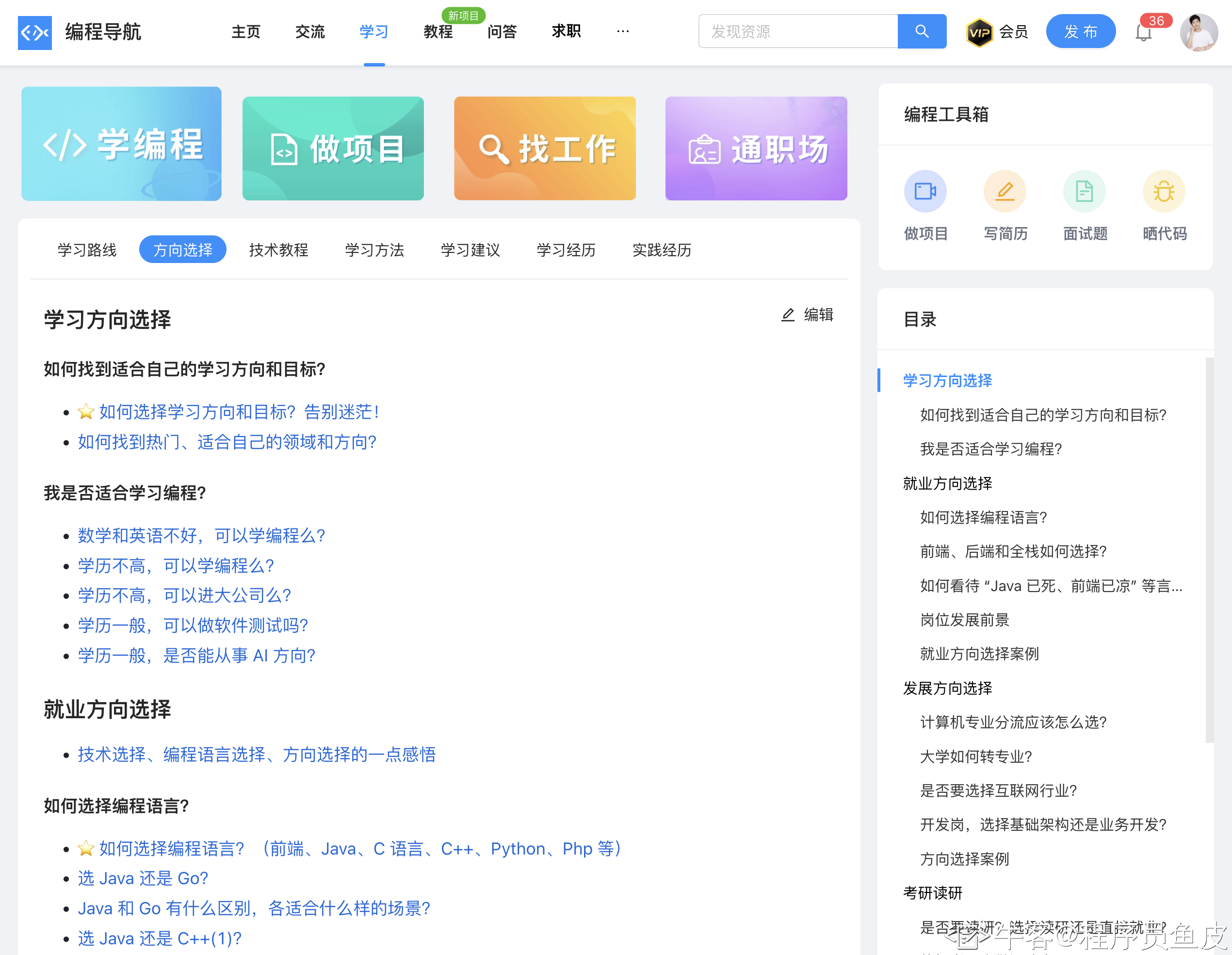 以计算机相关岗位为例,门槛较低的主流岗位有后端开发、前端开发、全栈开发、软件测试、网络工程师,门槛较高的主流岗位有大数据、人工智能、算法工程师等。可以在 编程导航网站 的学习板块查看各方向的介绍和选择建议。