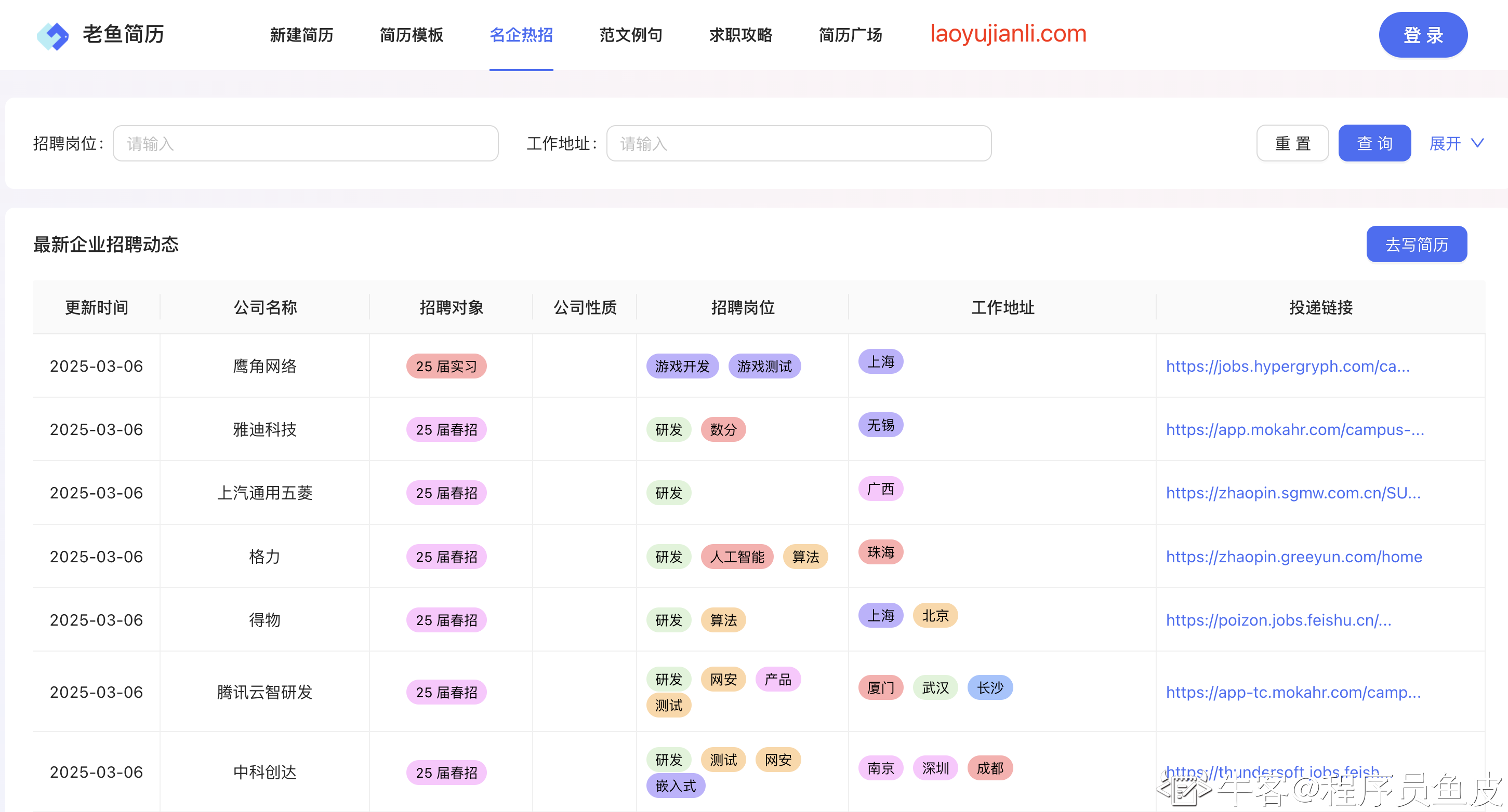 如果投递后长时间(比如一周)没有收到反馈,可以再次主动联系 HR 或者内推人了解简历的状态,一般公司官网都会有招聘方的联系方式的。主动联系能展示你的积极性和对岗位的热情。但是有一点很重要,提前准备好语言,礼貌且直接地说明来意就好,避免打扰到别人,比如:“您好,我在 XX 日期投递了 XX 岗位的简历,姓名为 XX,想了解一下目前招聘流程的进展,非常期待有机会参与面试。” 4)利用资源比起走马观花地浏览和查找岗位,可以关注一些求职博主、利用他们整合好的资源。比如我在 老鱼简历 上给大家提供了持续更新的投递时间表,相信也可以帮大家节省时间、把握机会。