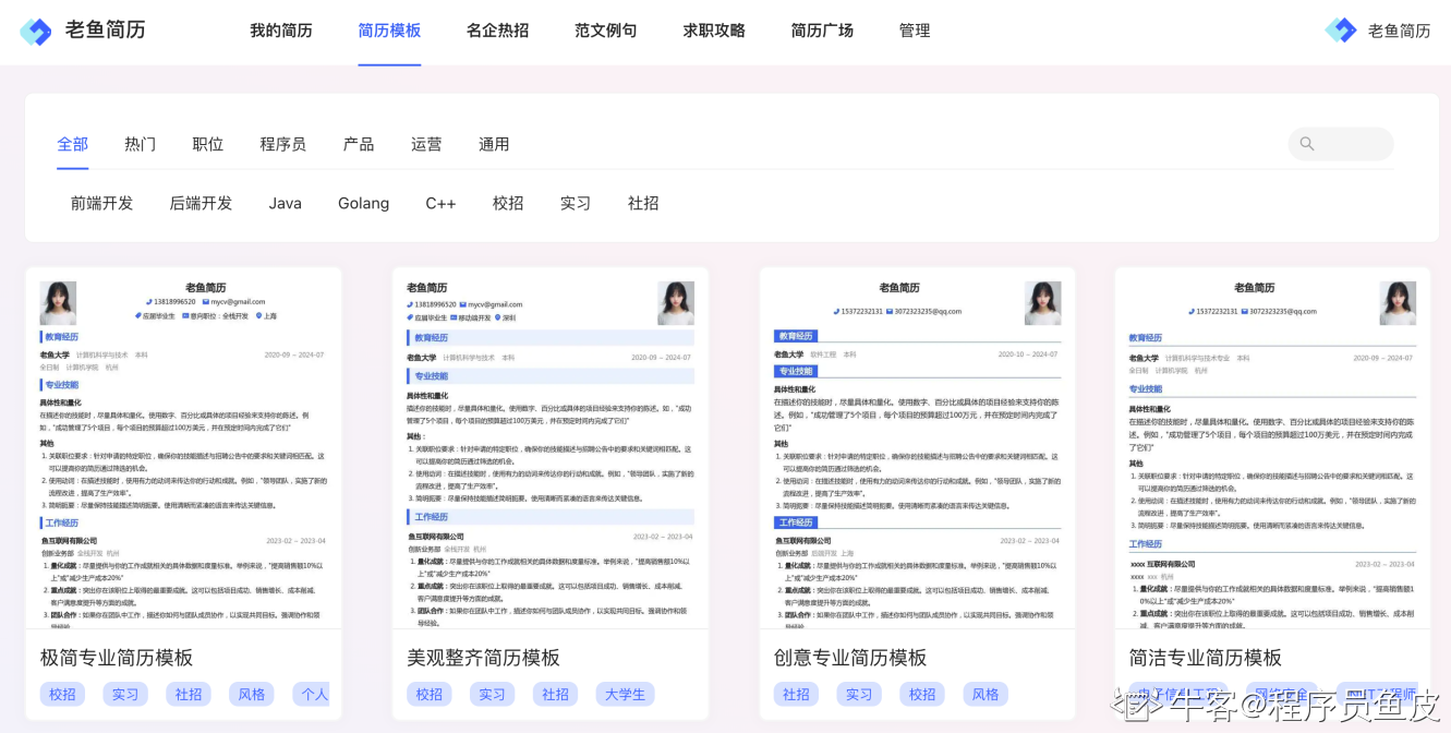 哇,内容好多,看来写简历好难啊!的确,从 0 开始写还是比较麻烦的,所以建议大家先找到一份现成的简历模板,比如 老鱼简历 上就有很多专业的、美观的简历模板,在此基础上进行修改就可以啦~ 但是千万不要直接抄袭或搬运别人的简历,谁知道简历会不会和论文一样被查重呢?