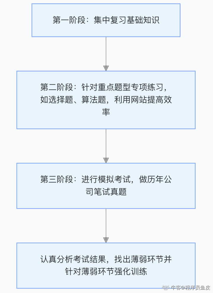 首先要 制定详细计划 ,多关注各公司的笔试信息,把要参加的笔试场次和岗位要求整理成一个表格,从中整理出高频考察的知识点,优先复习。 笔试的准备过程可以分为 3 个阶段: 第一阶段集中 复习基础知识,这样对面试也会有帮助,相当于不是专门把时间花在只准备笔试上。 第二阶段针 对重点题型进行专项练习,比如选择题和算法题,可以利用一些 网站 来提高学习效率。 第三阶段进行 模拟考试,多做几套历年公司笔试真题,并且要认真分析考试结果,找出自己的薄弱环节,有针对性地进行强化训练。 在整个准备过程中,记得用文档整理好错题,便于自己复习;如果没有学习动力的话,也可以加入相关的学习社群,跟大家交流交流、互换经验。