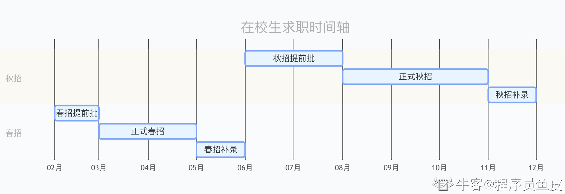 除了正式招聘外,在每年的春招时期,也是暑期实习生招募的热潮,通常是 2 ~ 5 月和春招一起开始,主要面向大二、大三、研一、研二的同学。如果你明年即将毕业,一定要重视暑期实习。一方面公司越来越注重求职者的实习经历,另一方面也是帮自己积累实践经验、验证自己是否适合这个工作岗位。 除了上面说的之外,还有一类很不错的机会,那就是 日常实习。很多公司会不定期地招募日常实习生,工作时间相对更灵活、适合所有在校生参与。比如我是在大三那年的 11 月份投递了字节跳动的日常实习,并且于 1 ~ 4 月份参与工作。