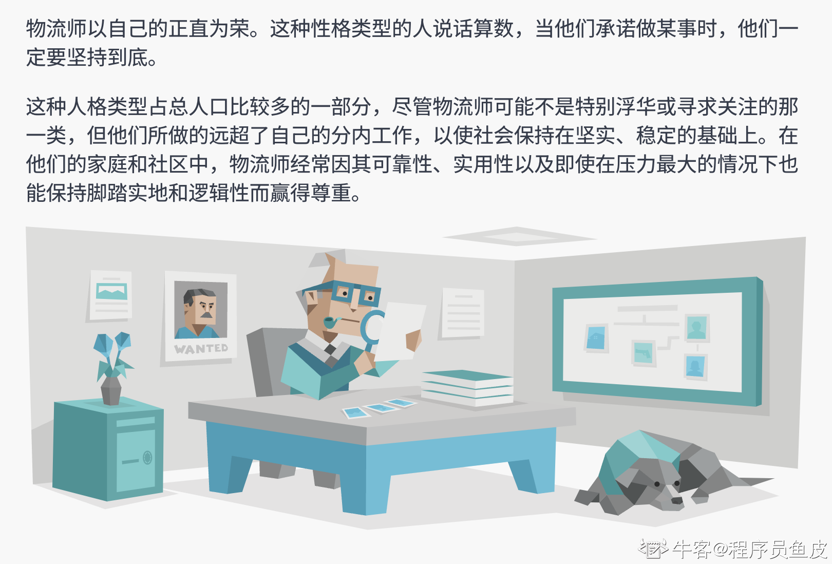你也要把这些问题想清楚,以计算机为例给几个建议: 你喜欢逻辑思考,可以选择后端开发;喜欢设计开发页面,可以选择前端开发 不打算读研,就不建议选择大数据、人工智能等岗位,不是没机会,只是会更难 以后如果想做自己的产品,建议选择后端开发,能锻炼业务理解能力 当然,想不清楚这些问题也没关系,可以先做个 MBTI 性格测试,更了解自己的性格并获取到一些职业发展建议。像我自己是 ISTJ 物流师,会更注重逻辑思考和追求效率,所以做了程序员。